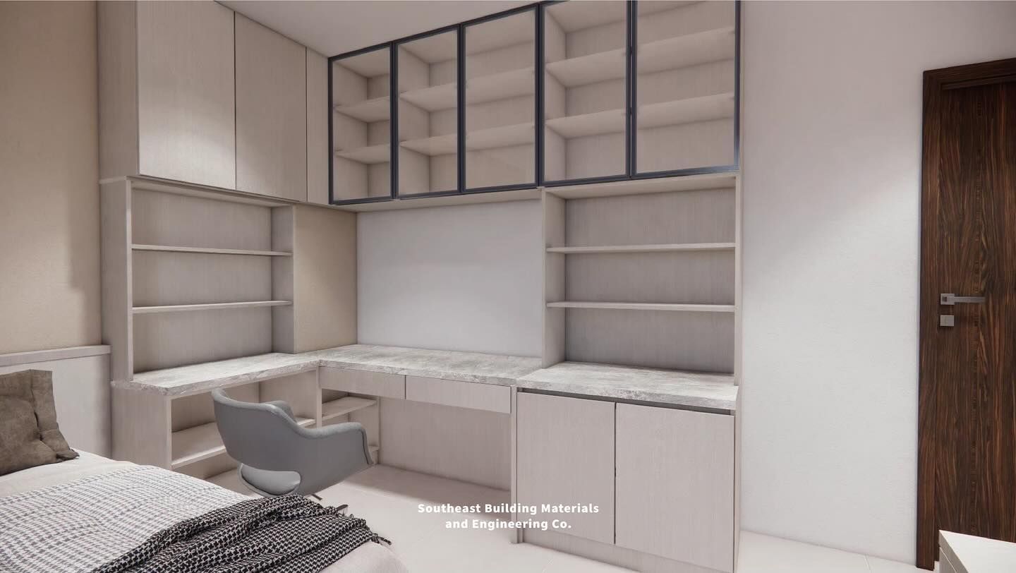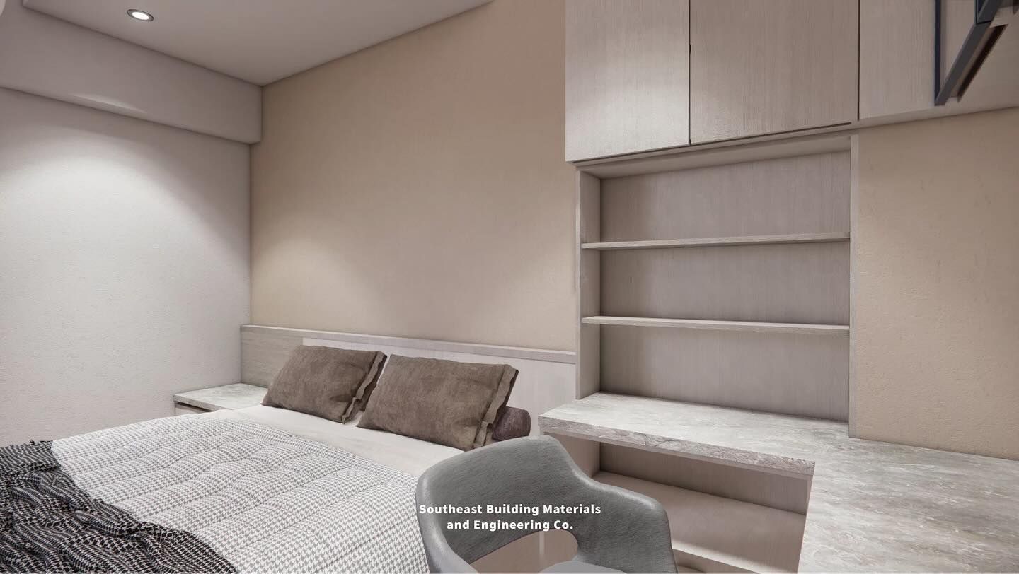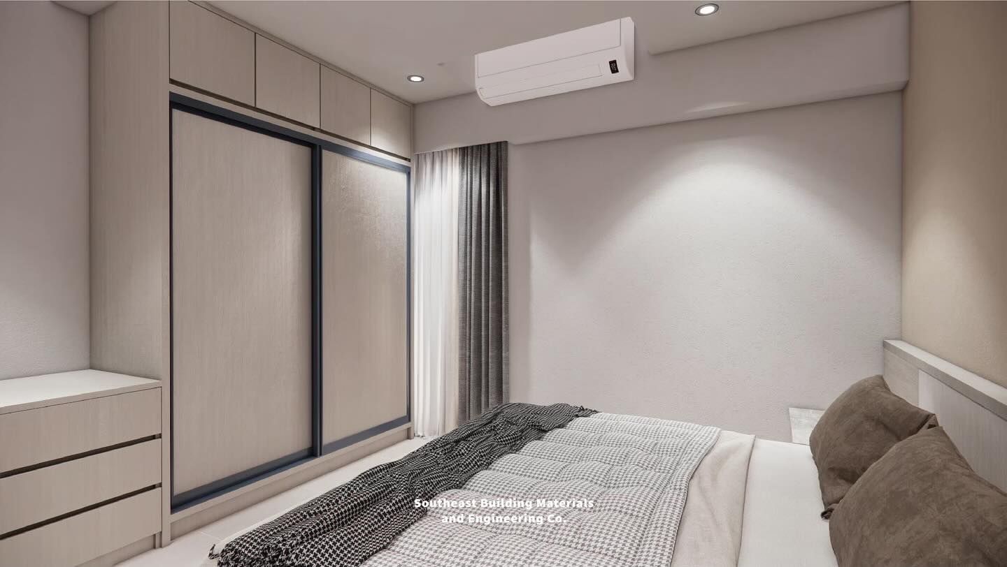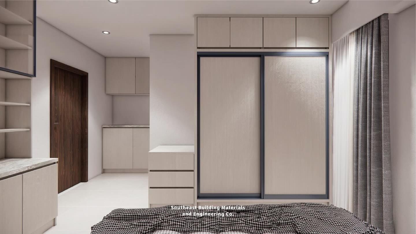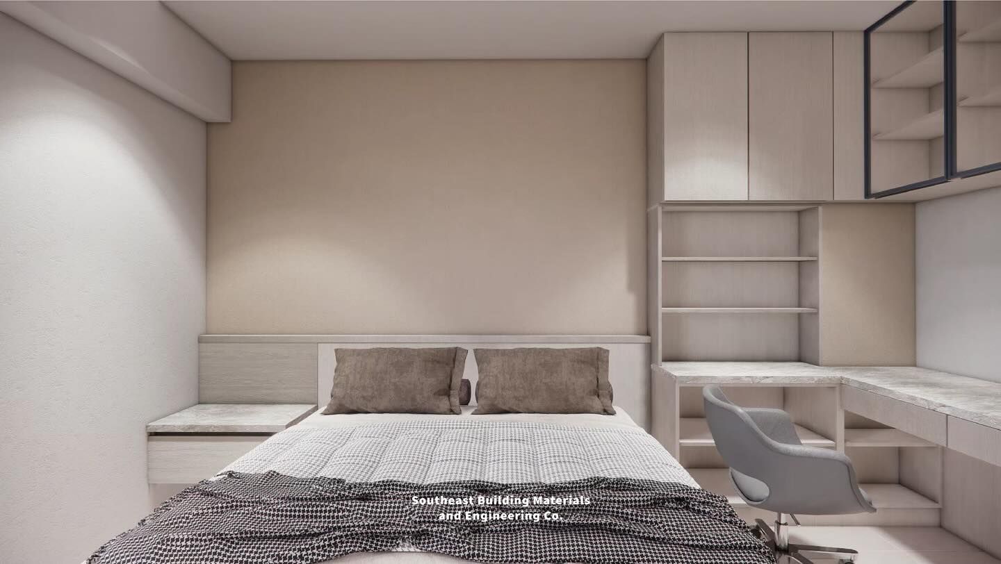 居家住宅空間,以簡約的風格,著重於「留白」與「收納」。臥室的裝潢以俐落線條設計,色調以米黃色作為基底,柔化光線,讓整體呈現溫暖而不刺眼的氛圍。
